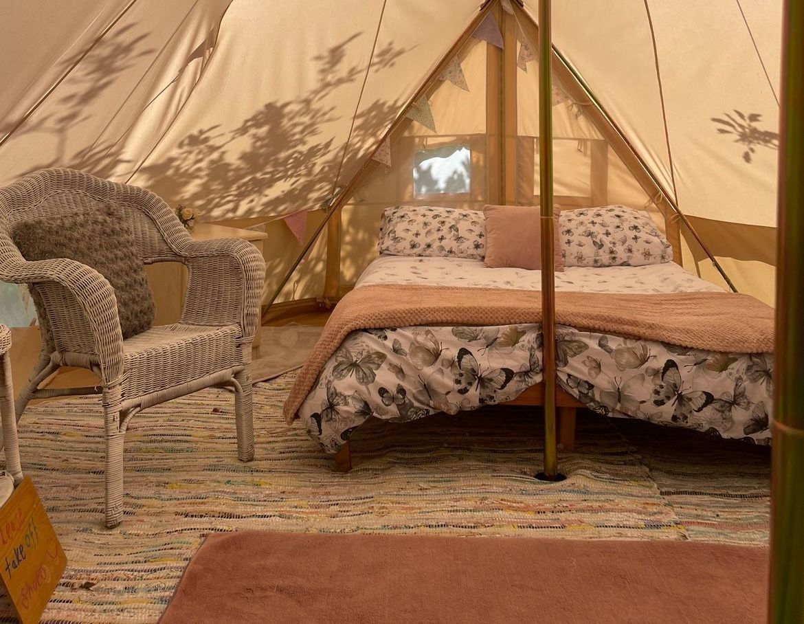 Tucked away in the heart of nature, the glampsite combines rustic charm with touches of luxury. Spacious bell tents offer the magic of traditional camping, with soft beds and cozy furnishings that make nights under canvas unforgettable. For those seeking extra comfort, charming shepherd huts provide snug hideaways, complete with wood-burning stoves, king-size beds, and private ensuite facilities.